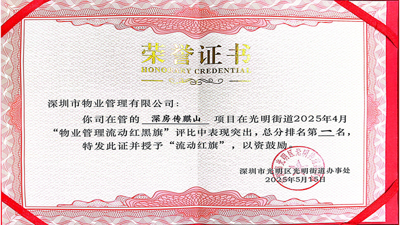 2025-06-10国贸深物公司获光明街道住宅小区物业管理流动红旗近日,光明街道召开住宅小区品质提升管理评比颁旗会议,国贸深物公司在管项目深房传麒山小区以104.9分位列第一,被授予流动红旗和k8凯发版官网的荣誉证书。