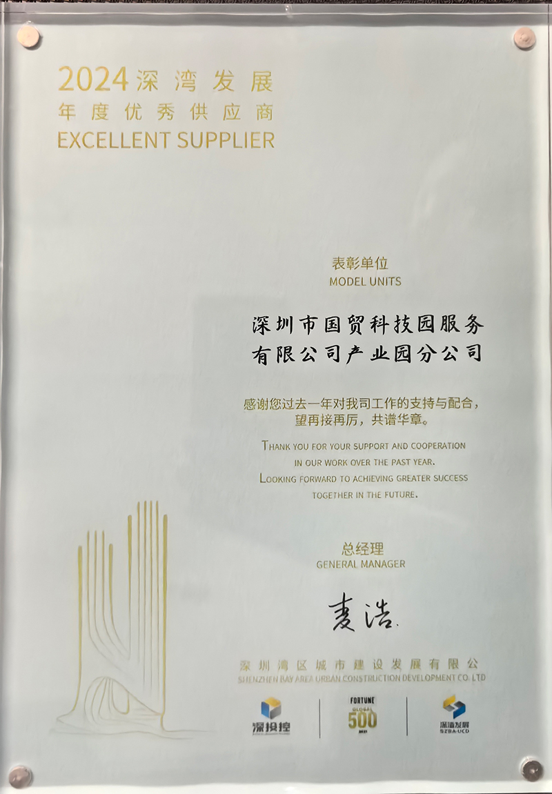 2025-05-15国贸科技园公司产业园分公司连续四年获评深湾发展“年度优秀供应商”近日,国贸科技园产业园分公司再次获评“2024深湾发展年度优秀供应商”。